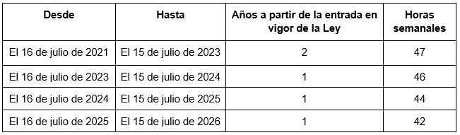 La reducción de la jornada laboral se implementará de forma gradual durante los próximos años. A partir de la entrada en vigencia de la ley, transcurridos 2 años, se reducirá una hora de la jornada laboral semanal, quedando en 47 horas. Después de 3 años, se reducirá otra hora, llegando a 46 horas semanales, y a partir del cuarto año, se reducirán 2 horas cada año hasta alcanzar las 42 horas semanales. A continuación, se detallan los plazos establecidos para esta transición gradual: